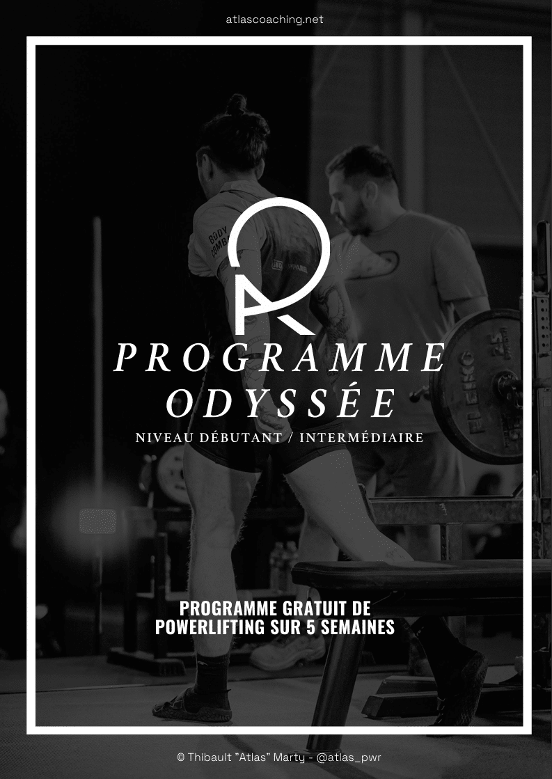 Le Programme Odyssée est un programme de force gratuit étalé sur 5 semaines, que j’ai décidé de créer pour donner un petit aperçu des programmes que je concocte à mes élèves qui font de la force. L’objectif ? Gagner en performances sur le squat, le développé couché et le soulevé de terre.